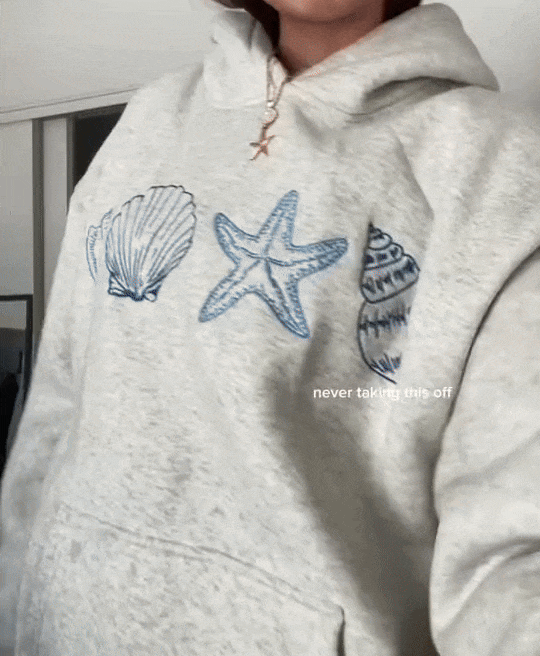 This gives major coastal girl vibes Soft, oversized, and covered in the cutest little shells and starfish it’s like wrapping yourself in sunshine and sea breeze The kind of cozy you’ll never want to take off.